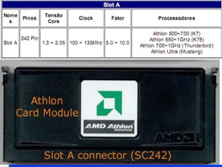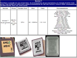 O documento descreve o funcionamento do processador como o 'cérebro' do computador, destacando suas funções de execução de programas e sua importância como componente caro. Apresenta um histórico dos processadores, mencionando principais fabricantes como Intel e AMD, e detalha os modelos e cuidados ao manuseá-los. Também inclui links úteis para informações adicionais sobre hardware.