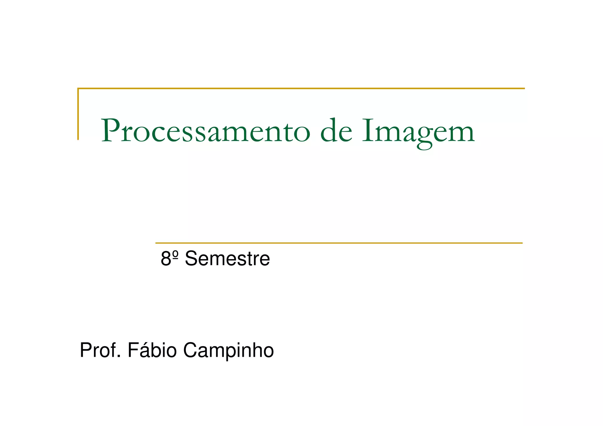 O documento apresenta um plano de aula para o curso de Processamento de Imagem no 8o semestre. Serão abordados tópicos como digitalização, armazenamento, processamento, análise espectral e técnicas de restauração de imagens. As avaliações incluem provas teóricas e apresentação de trabalhos.