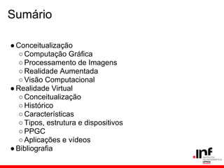 O documento aborda conceitos fundamentais de computação gráfica, processamento de imagens, realidade aumentada e visão computacional, explorando suas origens, aplicações e impacto no mercado. Destaca a evolução da realidade virtual e suas características, bem como seus dispositivos e históricos de desenvolvimento. Diversas aplicações são mencionadas em áreas como medicina, entretenimento e segurança pública.