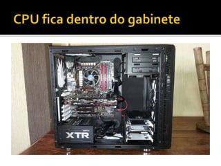 O documento discute como os computadores se comunicam com o mundo exterior através de equipamentos de entrada e saída, que traduzem a linguagem binária do computador para a linguagem humana e vice-versa. Estes equipamentos permitem realizar tarefas como ouvir música, assistir vídeos, imprimir documentos e digitalizar fotos.
