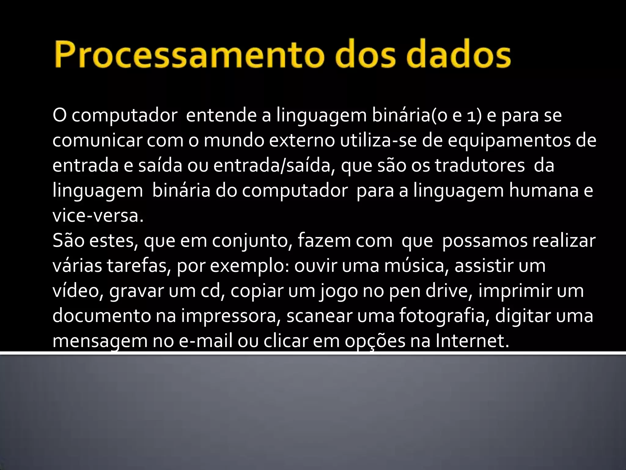 O documento descreve o processamento de dados em computadores, incluindo equipamentos de entrada e saída que permitem a comunicação entre usuários e computadores, traduzindo entre linguagem binária e humana. Exemplos mostram como dados digitados, arquivados ou capturados são processados para serem exibidos, reproduzidos ou impressos. A CPU é responsável por processar todas as tarefas do computador.