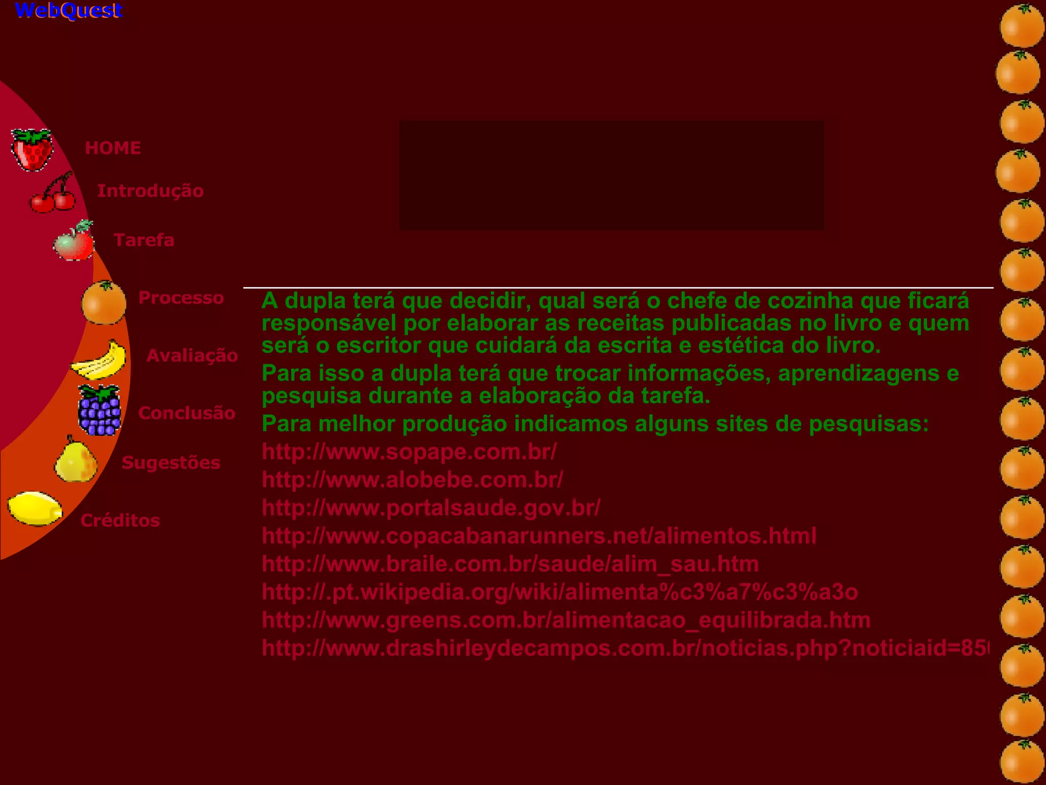 A dupla terá que decidir quem será o chefe de cozinha responsável pelas receitas e quem será o escritor responsável pela escrita e estética do livro. Eles terão que trocar informações e pesquisar durante a elaboração do trabalho, e alguns sites são sugeridos para pesquisa sobre alimentação e culinária.