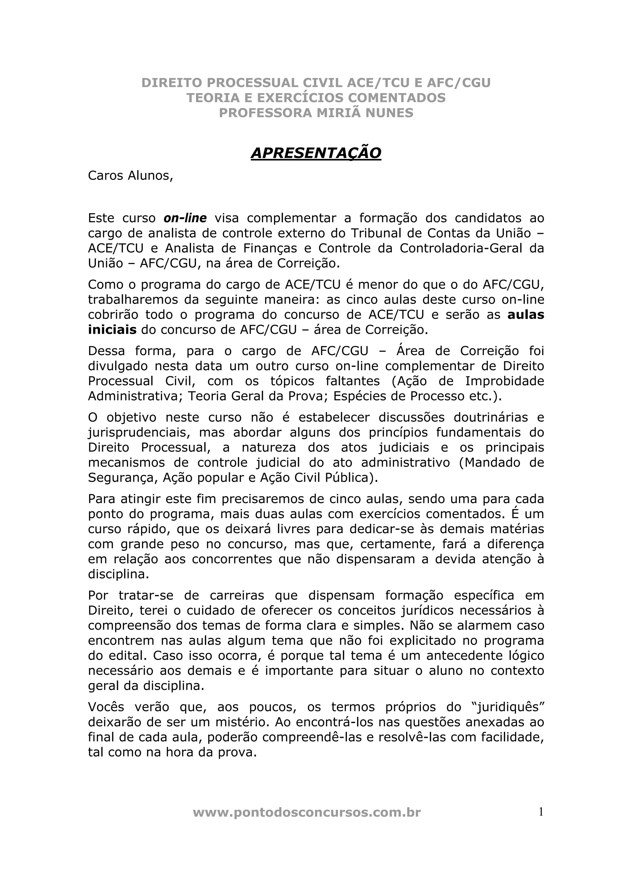 Este documento apresenta um curso on-line de Direito Processual Civil para candidatos aos cargos de analista de controle externo do Tribunal de Contas da União (ACE/TCU) e Analista de Finanças e Controle da Controladoria-Geral da União (AFC/CGU). O curso abordará os princípios constitucionais do Direito Processual Civil, os atos judiciais, e os principais mecanismos de controle judicial dos atos administrativos, como o mandado de segurança, a ação popular e a ação civil pública. O curso ter