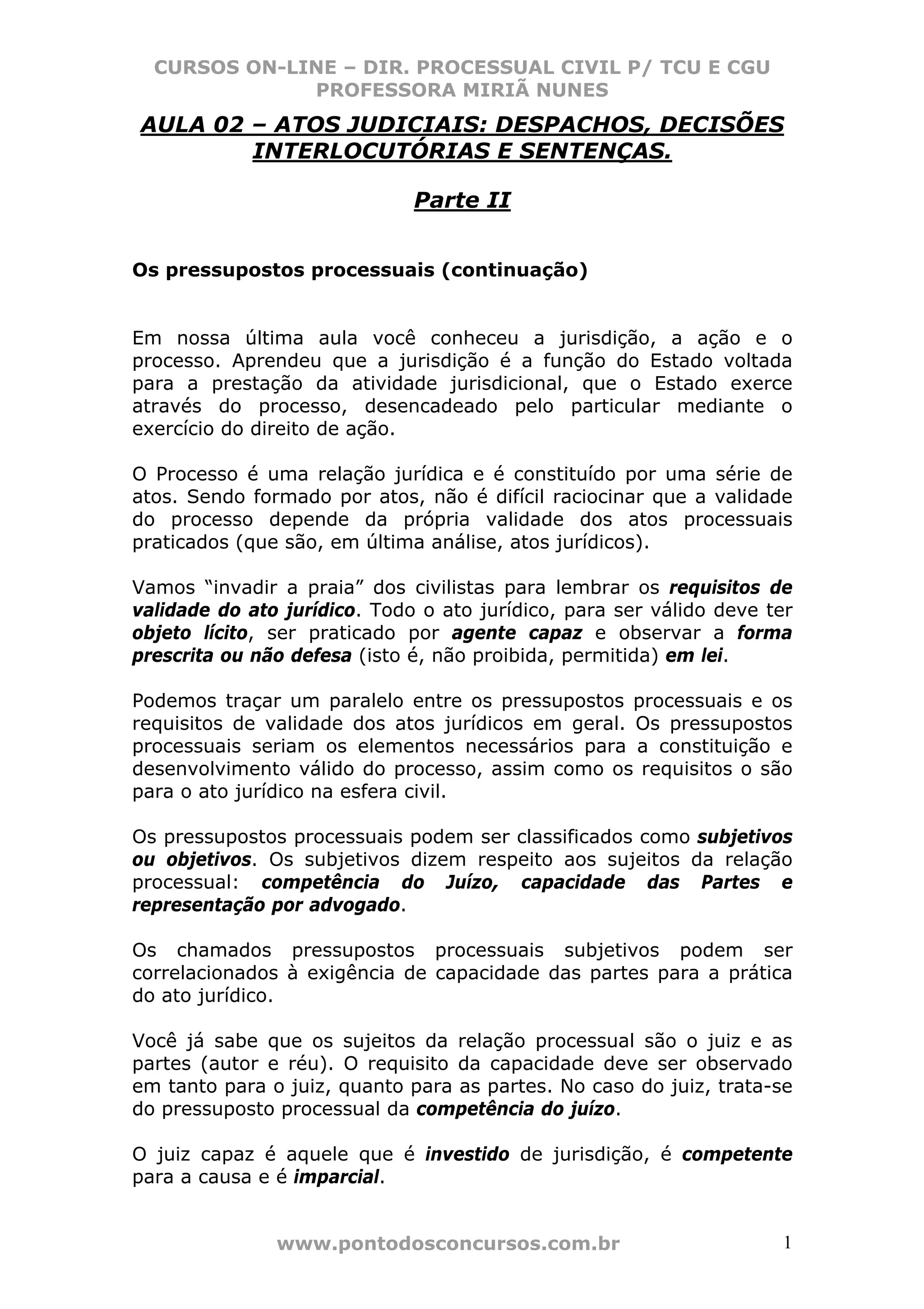 O documento discute os pressupostos processuais necessários para a validade de um processo, dividindo-os em subjetivos e objetivos. Os subjetivos incluem a competência do juiz, capacidade das partes e representação por advogado. Os objetivos incluem a forma procedimental adequada, citação válida, inexistência de litispendência, coisa julgada e perempção e petição apta. O documento explica cada um desses pressupostos.