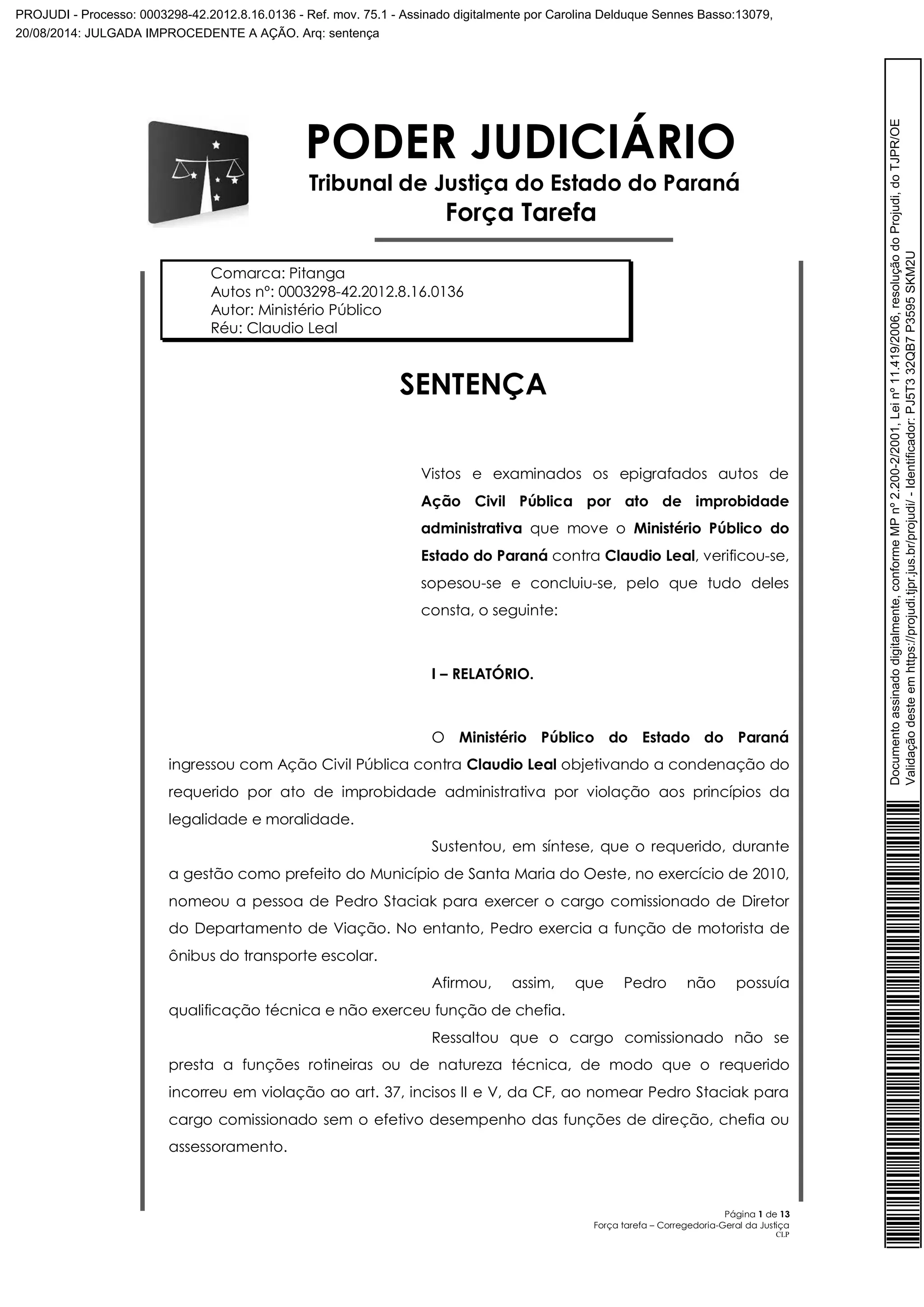 1) O Ministério Público moveu ação civil pública contra Claudio Leal alegando ato de improbidade administrativa por nomear Pedro Staciak para cargo comissionado sem qualificação técnica.
