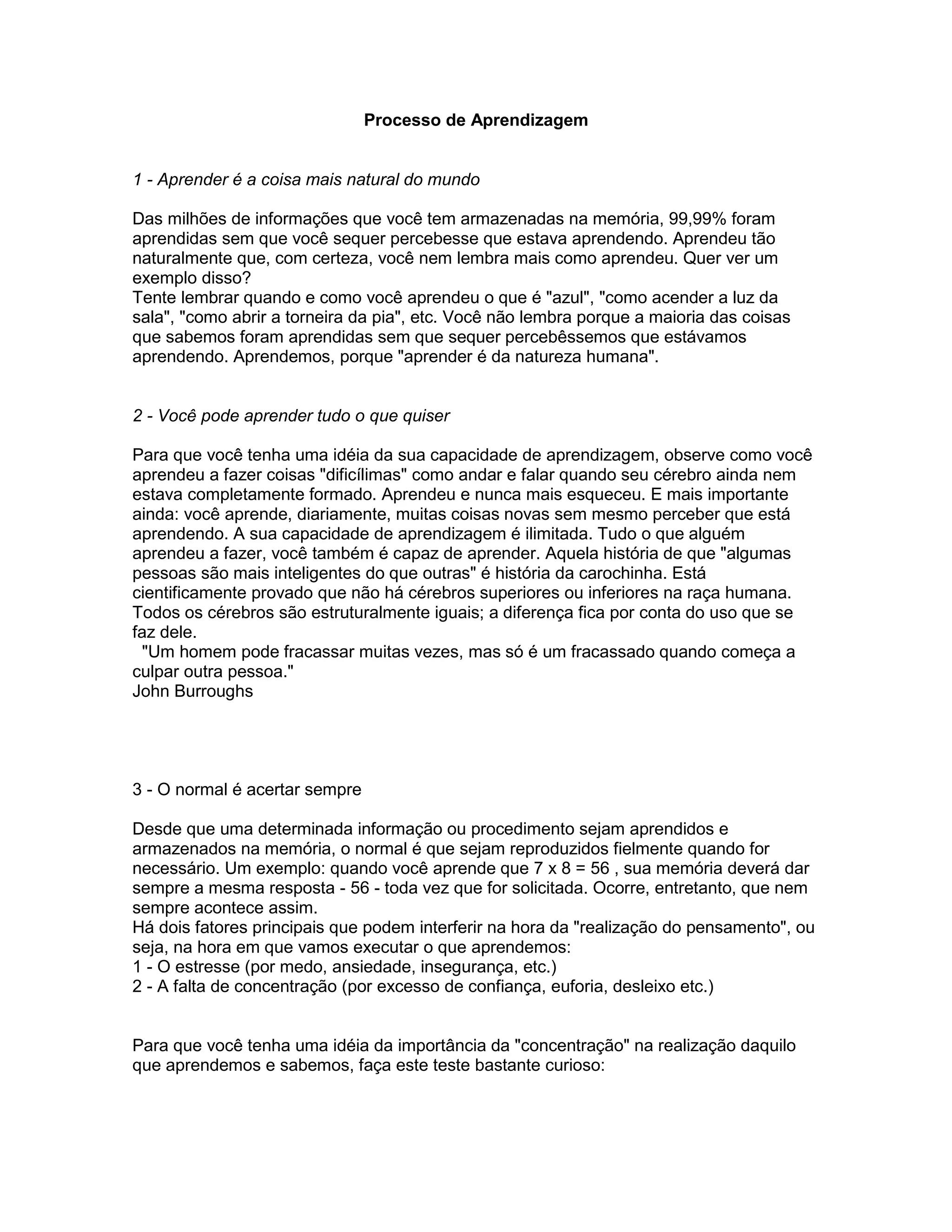 O documento discute o processo natural de aprendizagem humana, enfatizando que aprender é natural e que todos têm a capacidade de aprender qualquer coisa. Também destaca que a memória normalmente reproduz com precisão o que foi aprendido, mas que o estresse e falta de concentração podem interferir nisso, levando a erros. Reduzir o estresse e aprimorar a concentração ajuda a eliminar erros.