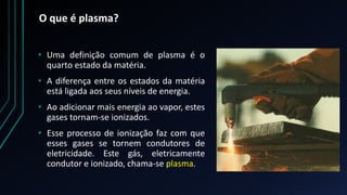 O documento descreve o processo de corte a plasma, explicando que plasma é o quarto estado da matéria onde os gases são ionizados pela adição de energia. Detalha os componentes do sistema de corte a plasma como a fonte de alimentação, circuito de ignição, tocha e gases utilizados no processo. Apresenta também as vantagens e desvantagens do corte a plasma.
