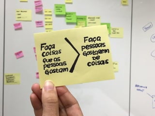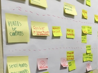 O documento descreve o processo de Design Thinking, definindo-o como uma abordagem centrada nas pessoas para inovação. Explica que envolve pesquisa com usuários, geração de ideias, prototipação e testes iterativos para resolver problemas de forma criativa. Também apresenta ferramentas como jornadas de usuário para mapear a experiência das pessoas.