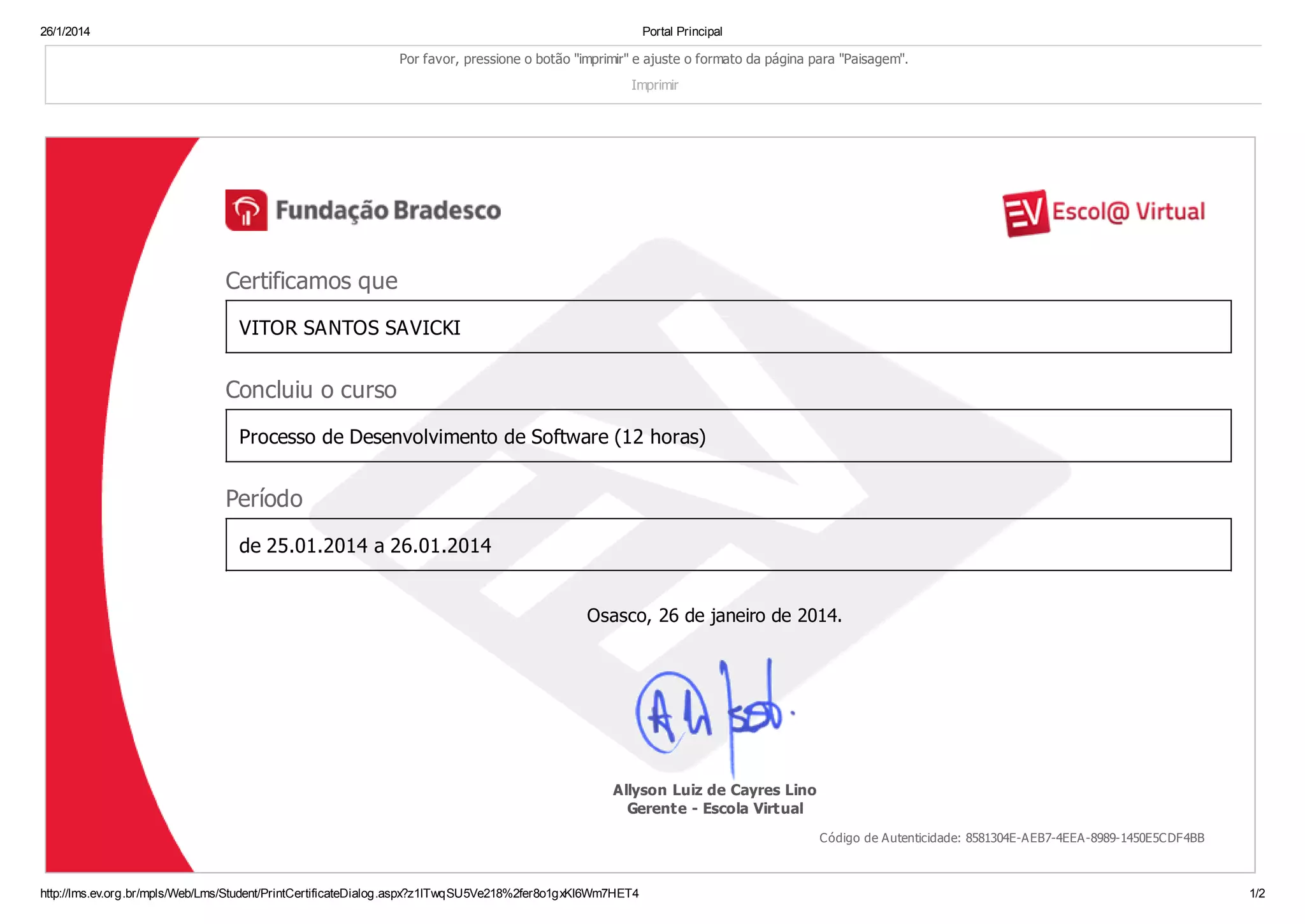 Vitor Santos Savicki concluiu com sucesso um curso de Processo de Desenvolvimento de Software de 12 horas realizado entre 25 e 26 de janeiro de 2014. O certificado foi assinado pela gerente da Escola Virtual Allyson Luiz de Cayres Lino.
