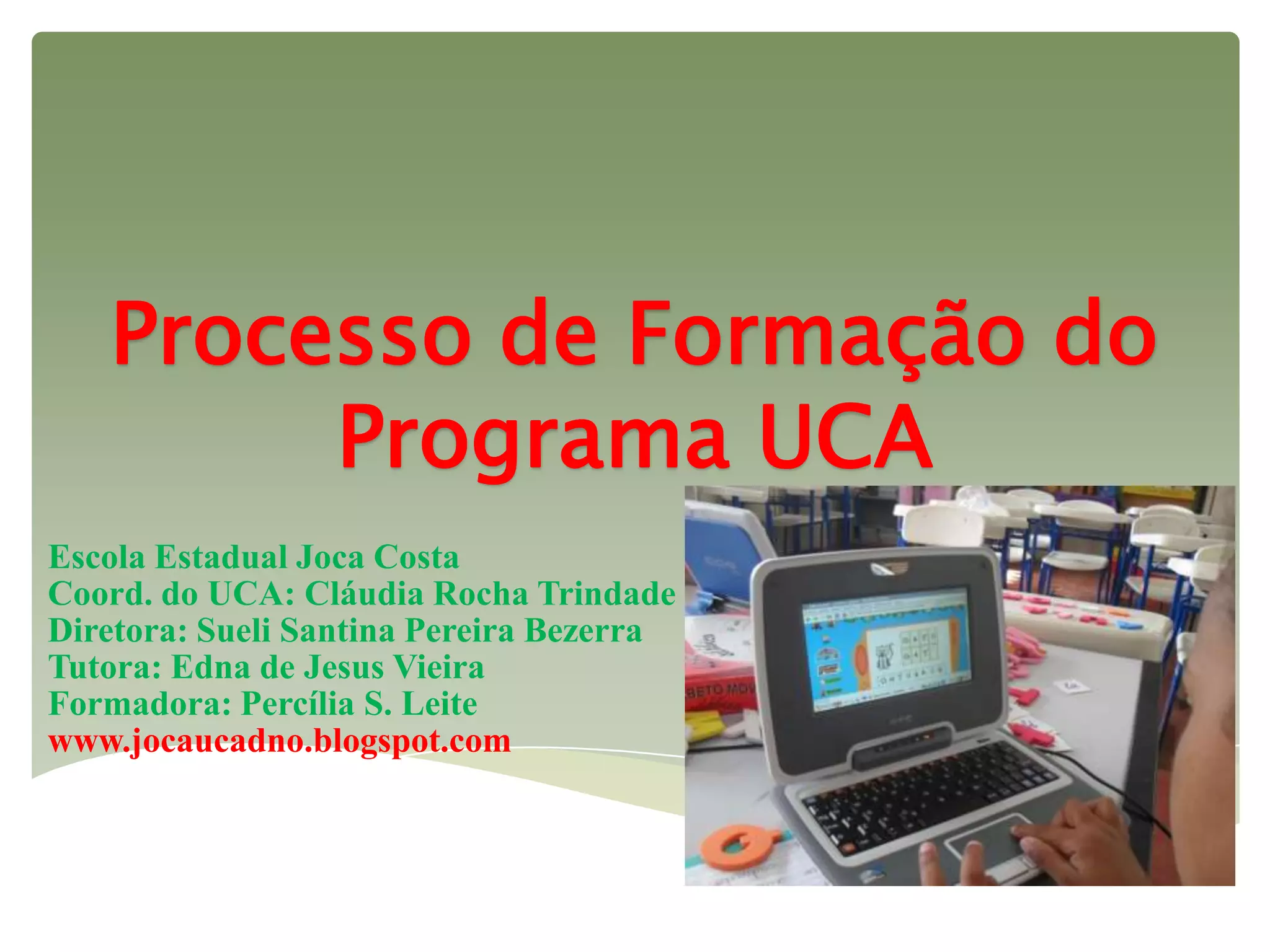 O documento descreve o processo de formação do programa UCA na Escola Estadual Joca Costa, incluindo a chegada dos laptops, capacitação dos professores, eleição e capacitação de monitores estudantis, e impacto positivo das tecnologias no ensino e aprendizagem.