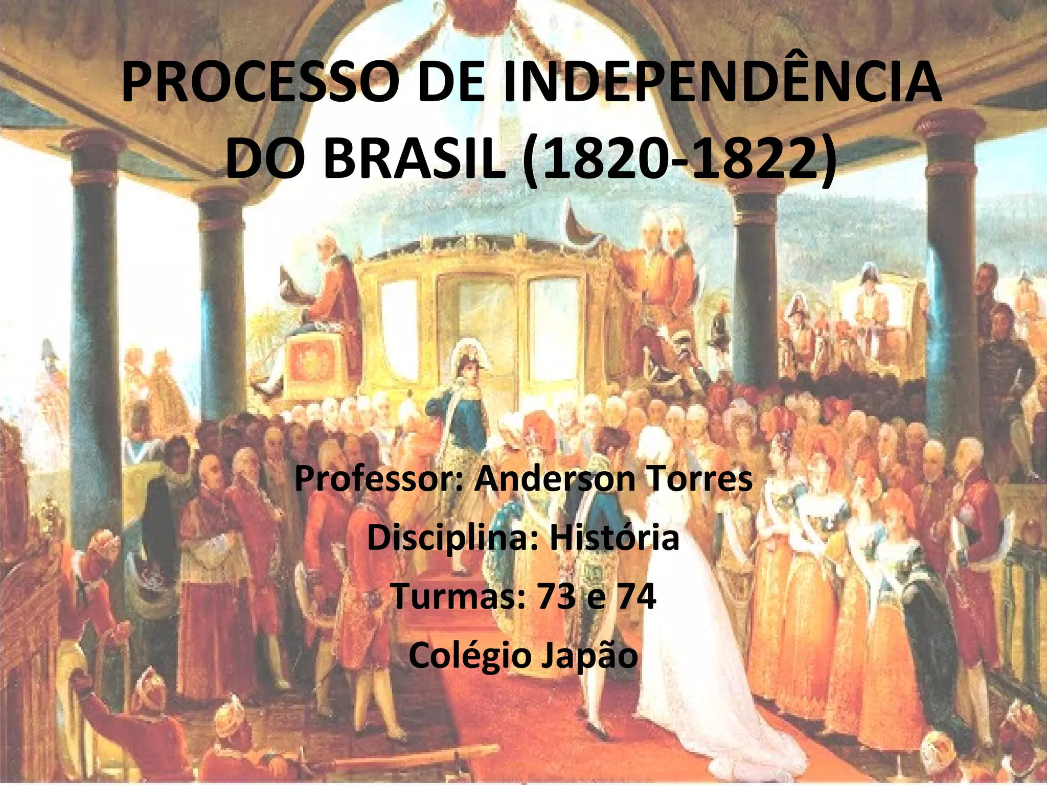 O documento resume o processo de independência do Brasil entre 1820-1822, incluindo as raízes no período da chegada da família real em 1808, a Revolução do Porto em 1820 que levou à declaração de independência em 1822, e os desafios na construção da nação brasileira após a independência.