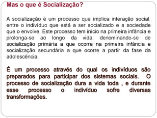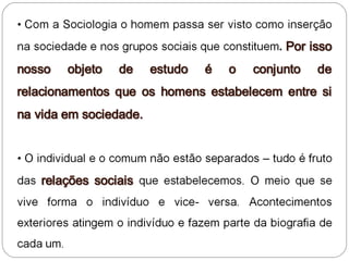 O documento discute o conceito de indivíduo e sua distinção em relação aos outros. Um indivíduo é um ser único com características não compartilhadas. O documento também discute como o indivíduo é formado pelas relações sociais e cultura do meio em que vive.