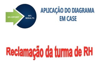 O documento apresenta o diagrama de Pareto, que mostra que 20% das causas geram 80% dos efeitos. Ele ensina a ordenar os problemas por frequência para priorizar os mais importantes, focando nos planos vitais. Um exemplo mostra as causas de problemas em uma escola, com poucas causas vitais responsáveis pela maior parte dos problemas.