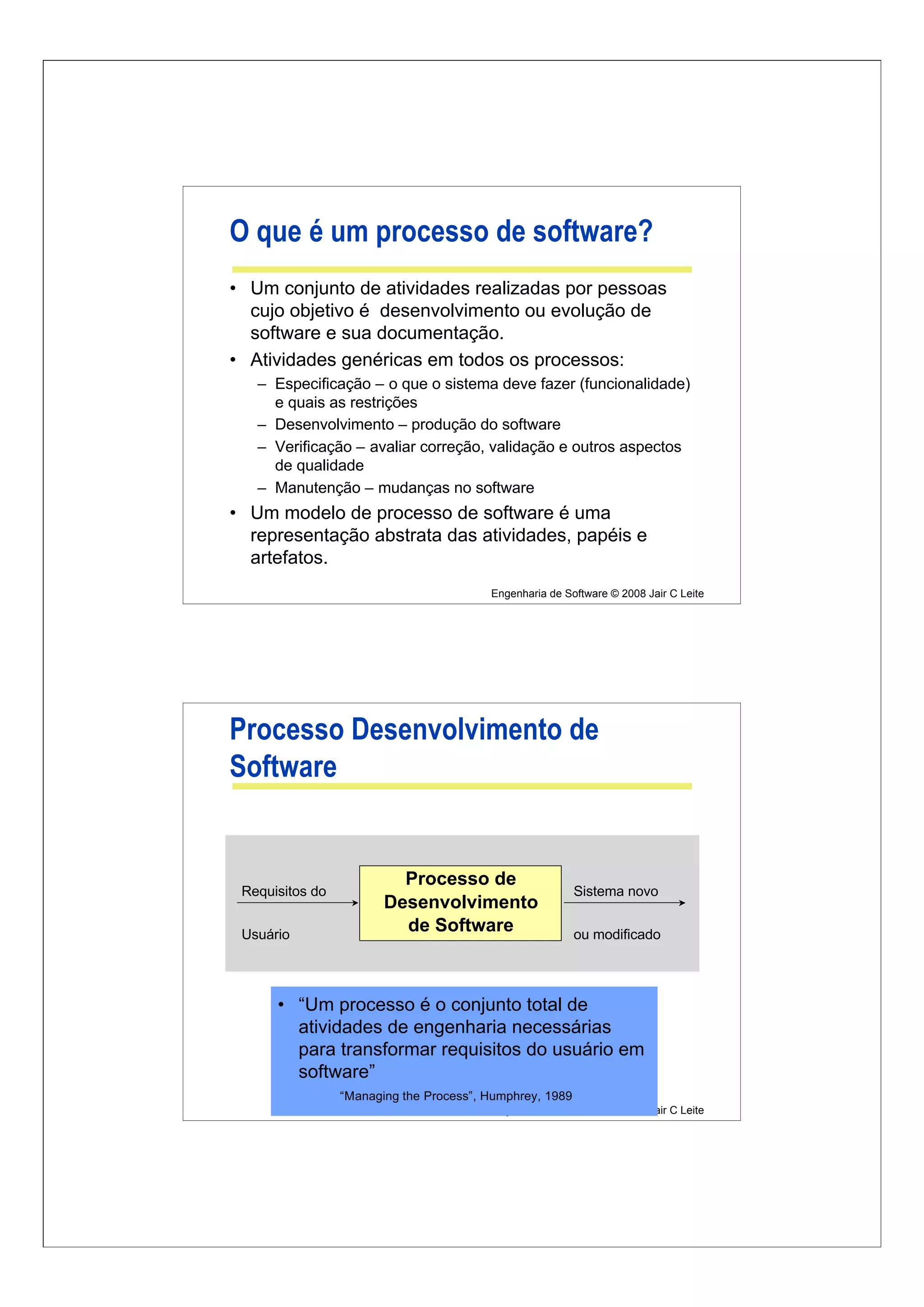 O documento discute os conceitos de processo de software, método e processo. Um processo de software é um conjunto de atividades que tem como objetivo desenvolver ou evoluir software e documentação. Processos incluem especificação, desenvolvimento, verificação e manutenção. Um método define o que, como e porque fazer, enquanto um processo determina ações práticas a serem realizadas por uma equipe.