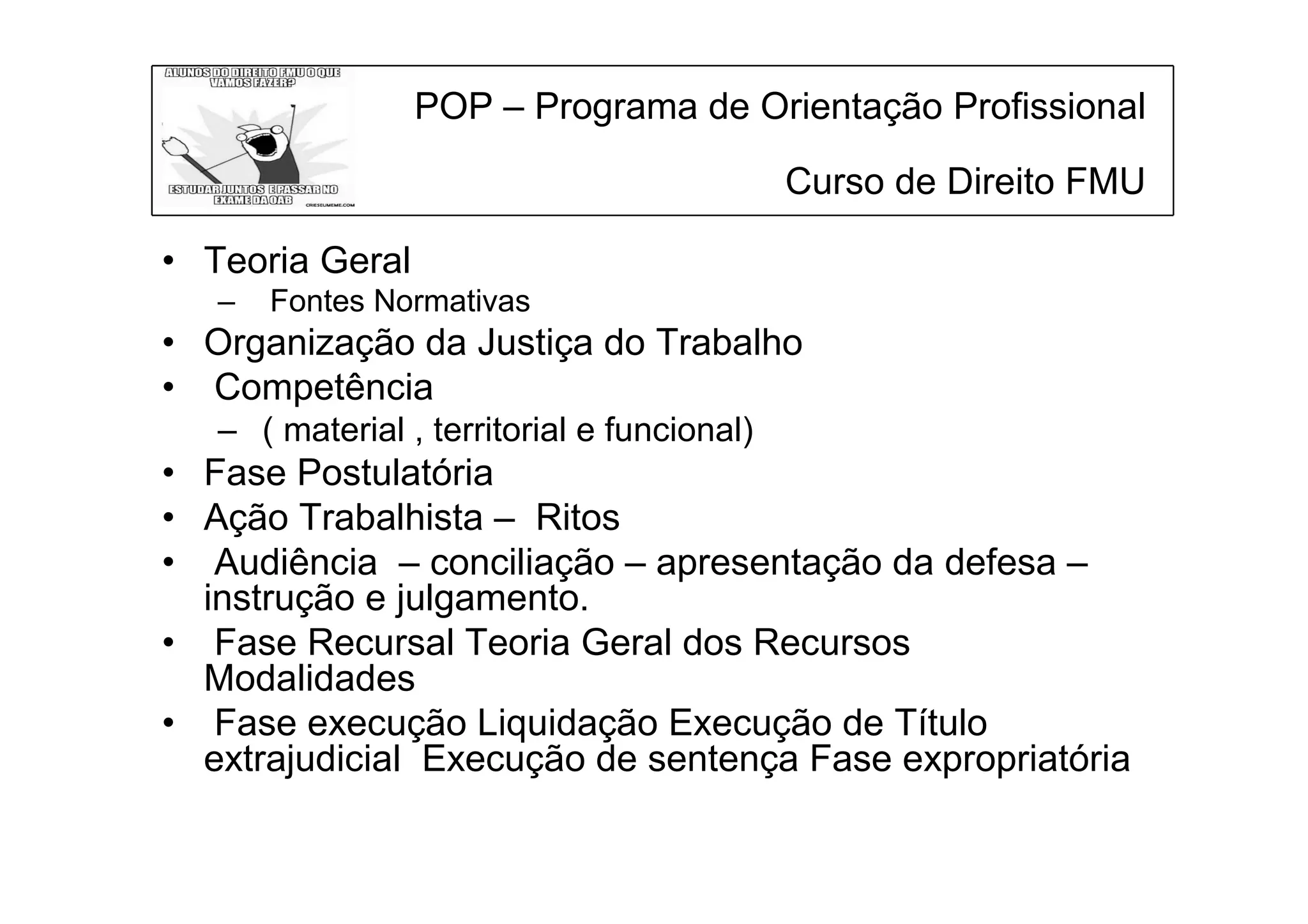 O documento descreve os principais tópicos abordados no curso de Direito do Trabalho da FMU, incluindo teoria geral do processo do trabalho, organização da justiça do trabalho, competência, fases do processo (postulatória, recursal e execução) e links para um blog com mais informações sobre cada tópico.