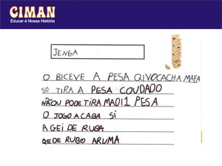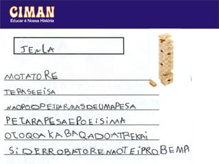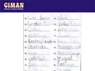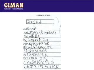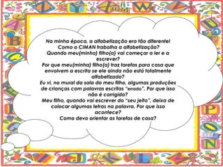 Este documento discute a alfabetização no Colégio CIMAN e fornece respostas às principais perguntas dos pais. O CIMAN vê a alfabetização como um processo contínuo de aprendizagem, levando em conta as diferentes hipóteses das crianças, em vez de focar apenas nos erros. As atividades são diversificadas de acordo com os níveis das crianças, e os desafios ao longo do ano 1 incluem reconhecer letras e fonemas e progredir na escrita alfabética.