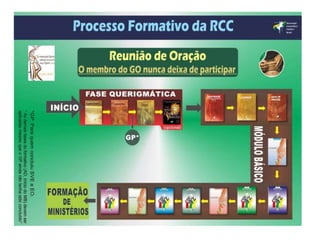 O documento discute a importância da formação no Renovação Carismática Católica Brasil (RCCBRASIL), descrevendo as diferentes etapas do processo formativo, incluindo a Fase Querigmática, o Módulo Básico, a Formação de Ministérios e o Grupo de Perseverança. A formação é vista como essencial para equipar os membros com conhecimento e experiência espiritual necessários para realizar a missão da Igreja de forma eficaz.