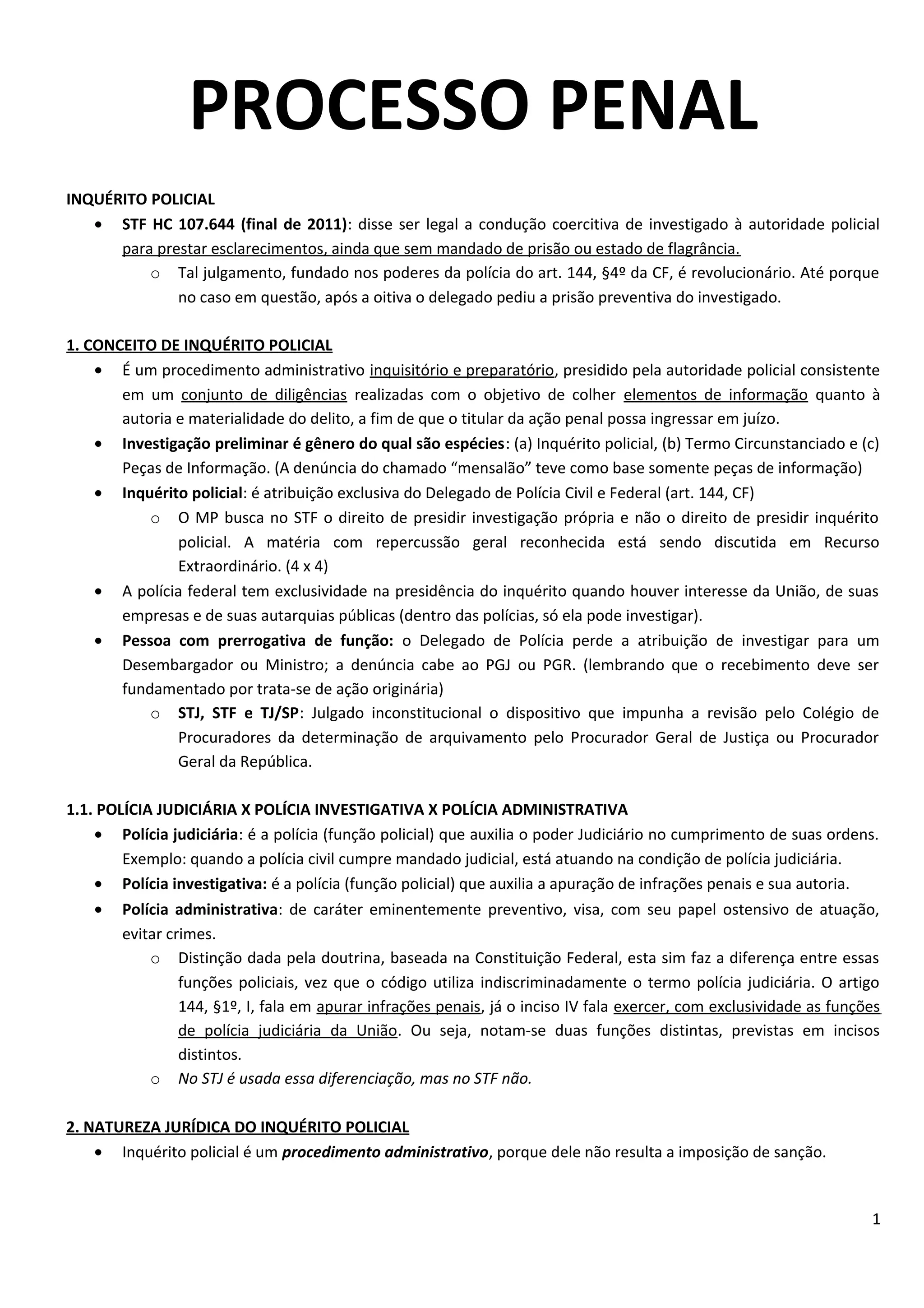 1. O documento descreve o conceito e natureza jurídica do inquérito policial, um procedimento administrativo preparatório realizado pela polícia para apurar a autoria e materialidade de um crime. 2. A distinção entre elementos de informação e provas é feita, sendo que elementos de inquérito não podem, isoladamente, fundamentar condenação, ao contrário das provas produzidas em contraditório judicial. 3. O inquérito policial tem como finalidade colher elementos para embasar a denúncia, decretar medidas cautelares e produzir provas urgentes ou