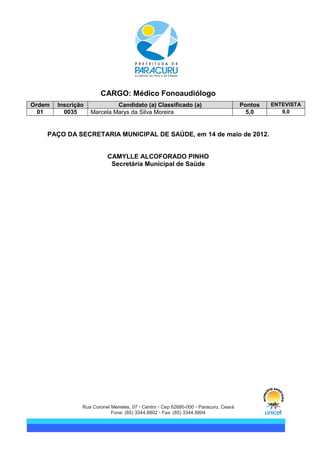 O documento apresenta os resultados da segunda etapa do processo seletivo público 01/2012 da Secretaria Municipal de Saúde de Paracuru. Foram listados os candidatos classificados para diferentes cargos nas áreas de atuação do Centro de Atenção Especializada, Estratégia de Saúde da Família, Centro de Especialidades Odontológicas, CAPS e NASF. A secretária municipal de saúde, Camylle Alcoforado Pinho, assina o documento em 14 de maio de 2012.