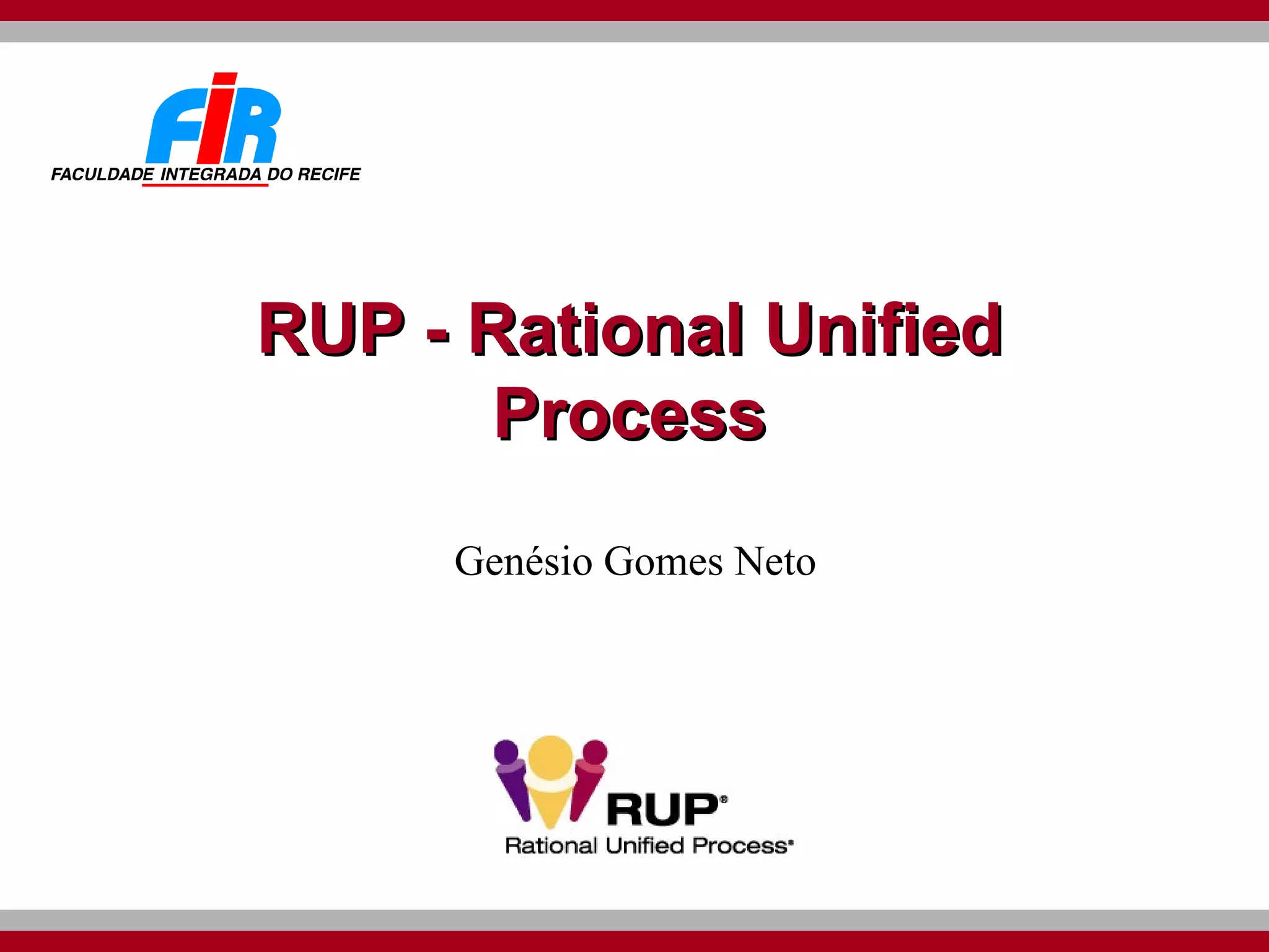 O documento apresenta um resumo sobre o Rational Unified Process (RUP). O RUP é um framework genérico e adaptável para desenvolvimento de software que utiliza modelagem visual, abordagem iterativa e incremental e é centrado em arquitetura e casos de uso. Ele define fases, disciplinas, atividades, artefatos e guias para auxiliar na gestão de projetos de software.