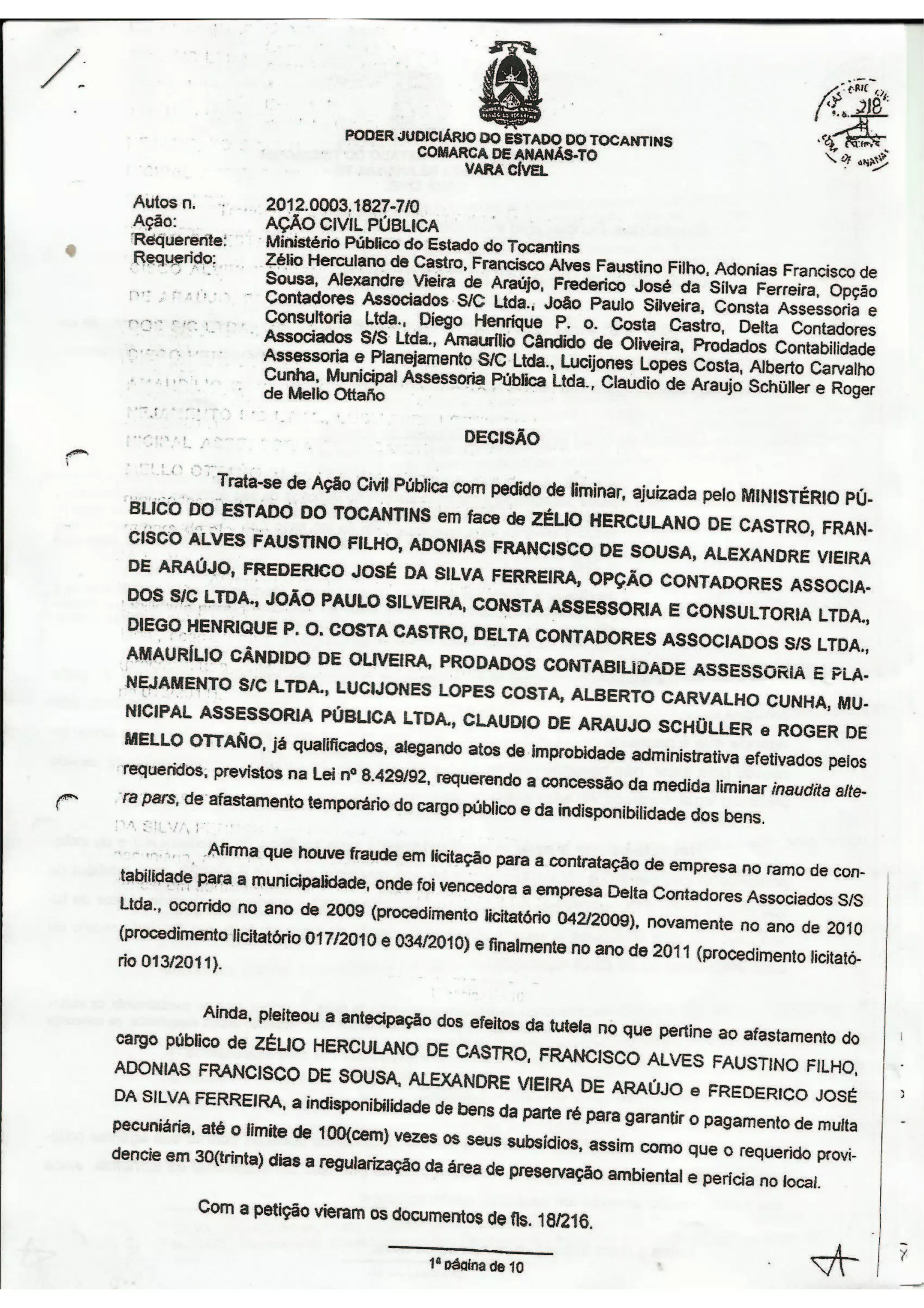 Processo Impetrado pelo Ministerio publico do Estado do Tocantins ao prefeito de Cachoeirinha