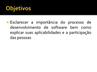 O documento discute os conceitos e aplicações de Processos de Desenvolvimento de Software (PDS), comparando modelos tradicionais como Cascata e RUP com modelos ágeis como SCRUM e XP. Resume que PDS organizam atividades, papéis e artefatos para o desenvolvimento de software, e que não existe um modelo perfeito, sendo importante customizá-los de acordo com cada organização.