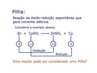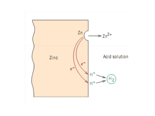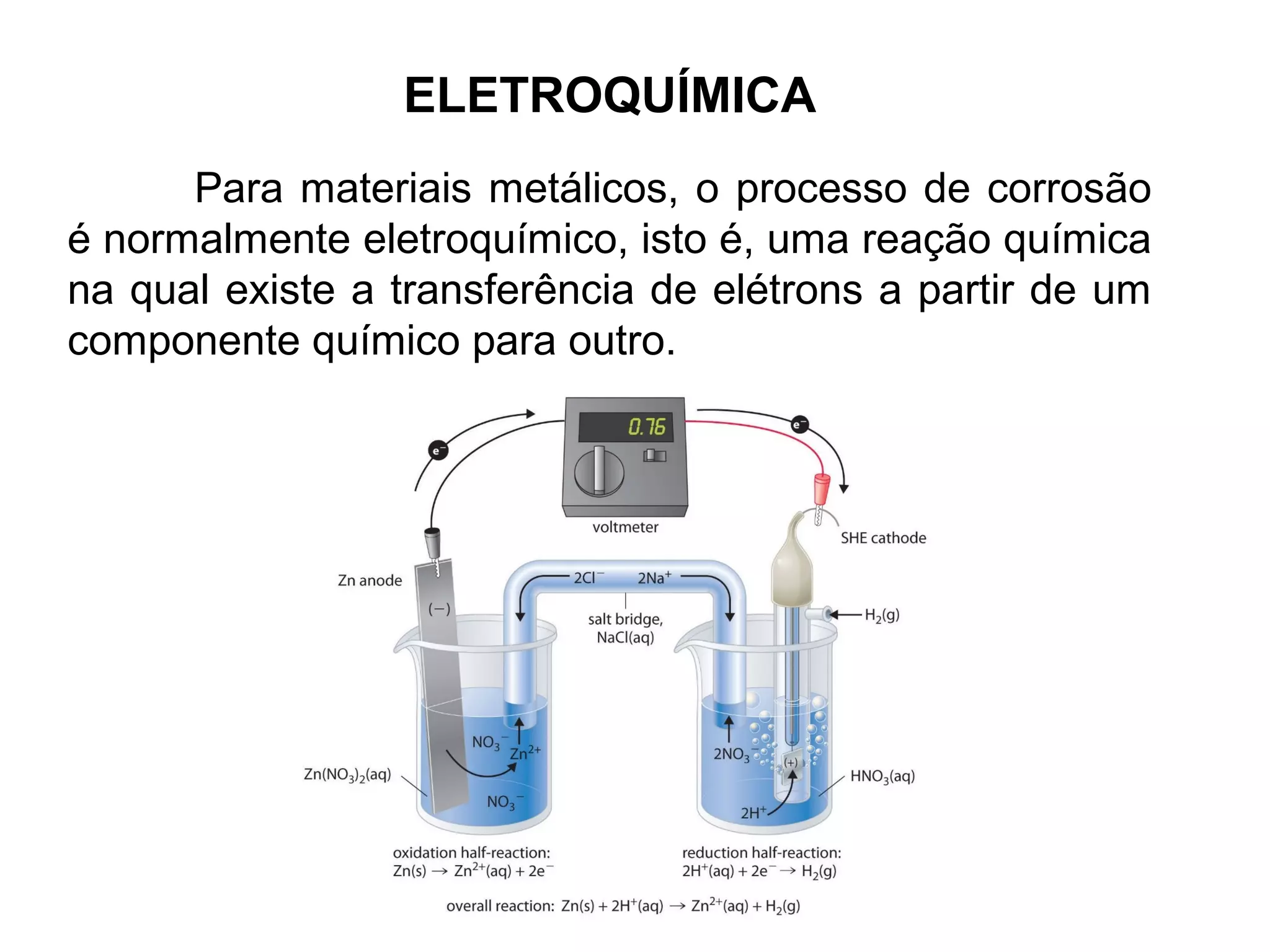 O documento discute processos eletroquímicos de oxidação e redução. A corrosão metálica é geralmente um processo eletroquímico no qual há transferência de elétrons de um metal para outro, levando à oxidação de um e redução do outro. A corrosão pode ocorrer de várias formas, incluindo uniforme, galvânica, em frestas, por pites, intergranular e por lixiviação seletiva.