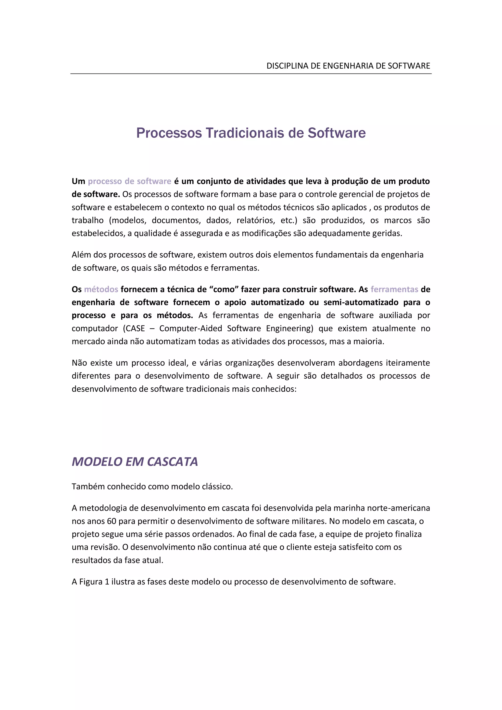 O documento descreve processos tradicionais de engenharia de software, incluindo o modelo em cascata, o modelo em espiral, a prototipação e o modelo incremental. Também discute o Rational Unified Process (RUP), que utiliza o Unified Modeling Language (UML) e é estruturado em fases e iterações.