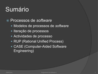 O documento discute processos de engenharia de software, incluindo: (1) modelos de processos como cascata e evolutivo, (2) atividades de processo como especificação, desenho e validação, (3) RUP como um processo moderno, e (4) CASE para apoiar processos de desenvolvimento de software.