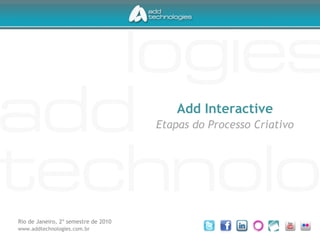 O documento descreve as etapas do processo criativo para design e usabilidade, abrangendo atividades desde briefing até a construção de interfaces. Inclui a criação de wireframes, protótipos navegáveis e planejamento gráfico, além de destacar a importância de identidade visual e design para plataformas móveis e interativas. Também menciona serviços relacionados a design de jogos e tecnologia 3D, direcionados a campanhas publicitárias e experiência do usuário.