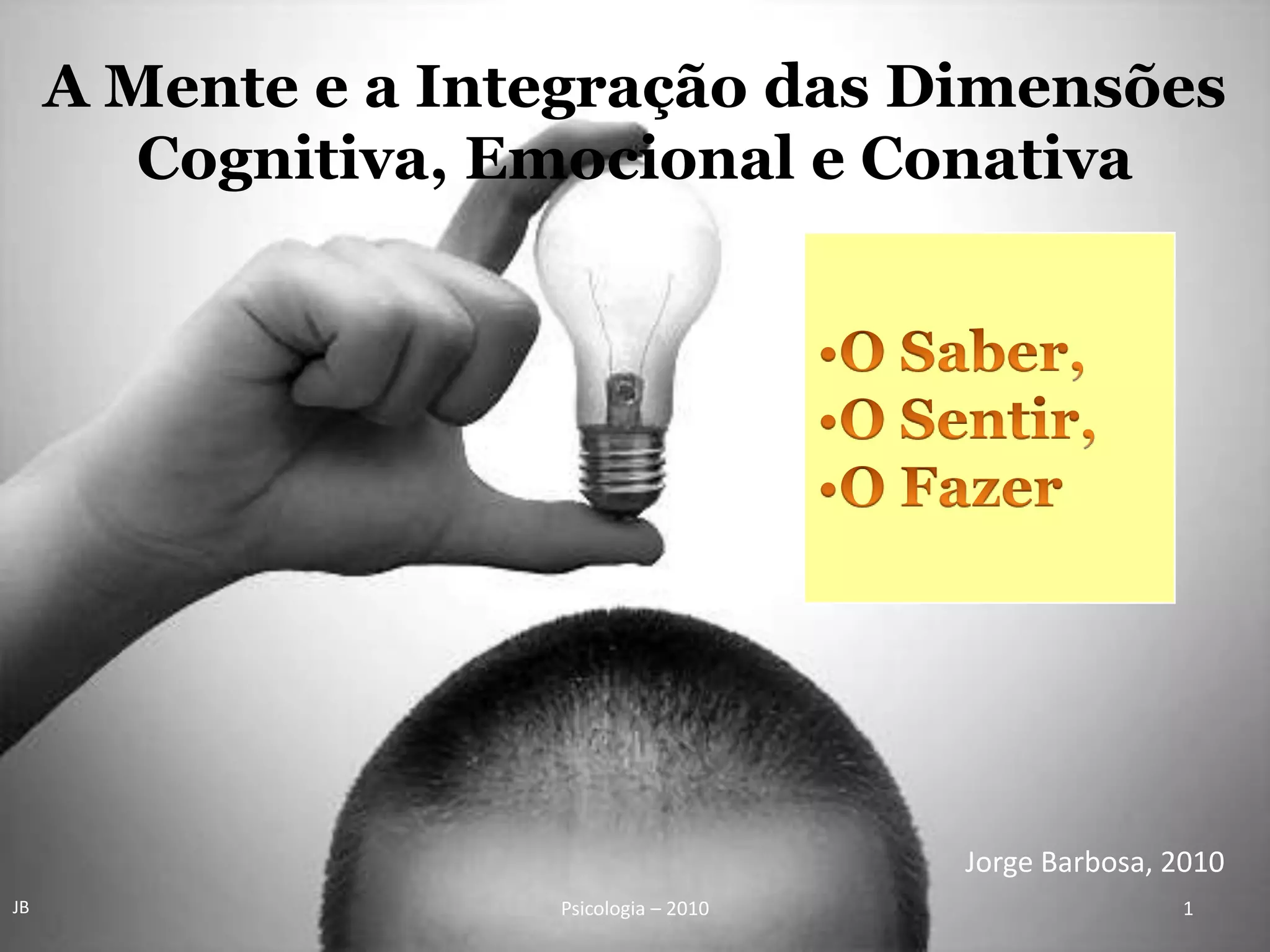Este documento discute os processos cognitivos, emocionais e conativos da mente humana. Ele caracteriza a mente como um sistema integrado destes processos e explica as especificidades da percepção, emoção, intenção e outros tópicos. O documento também analisa como estes processos funcionam na vida diária e na construção da identidade humana.