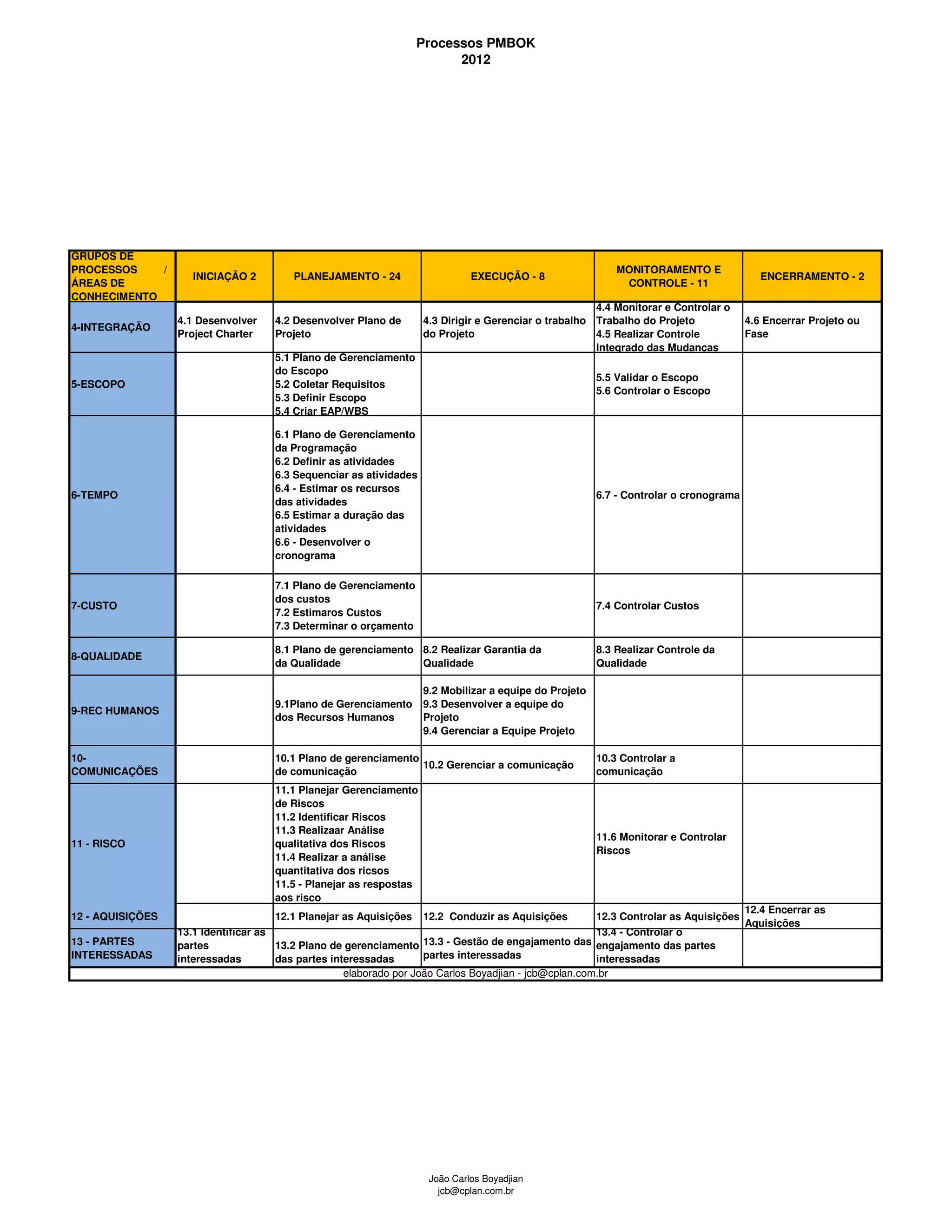 O documento descreve os processos do PMBOK divididos em 5 grupos: Iniciação, Planejamento, Execução, Monitoramento e Controle e Encerramento. Cada grupo contém processos relacionados a áreas do conhecimento como Escopo, Tempo, Custo e Qualidade. O documento fornece uma visão geral dos processos e atividades envolvidas na gestão de projetos.