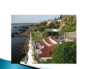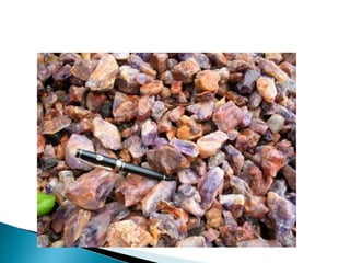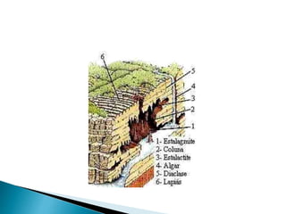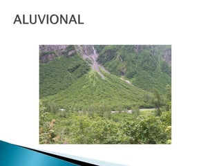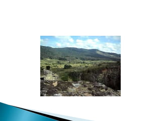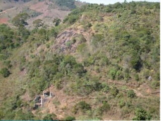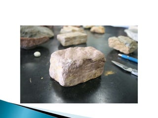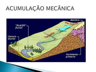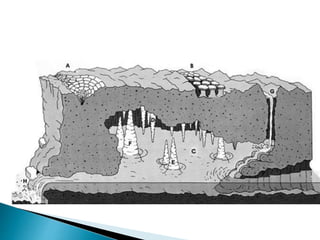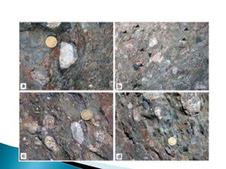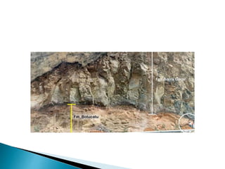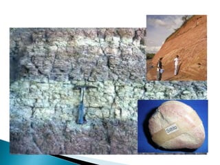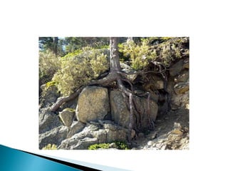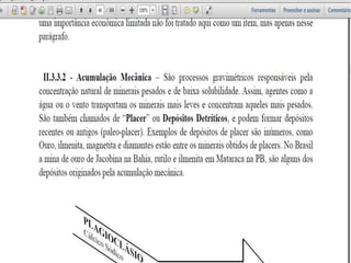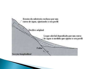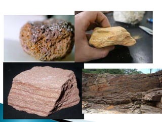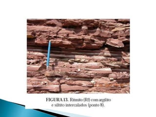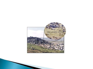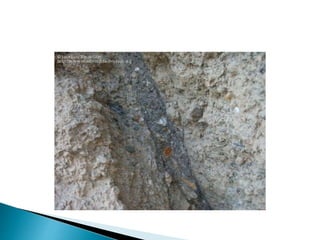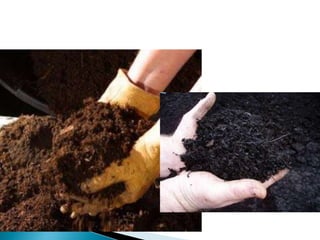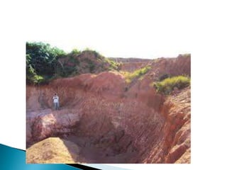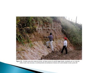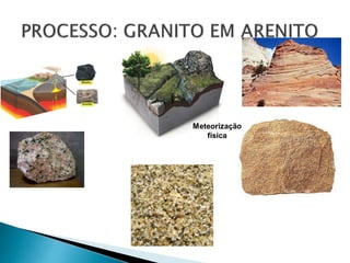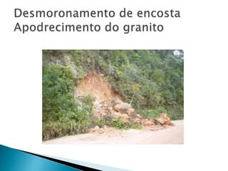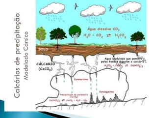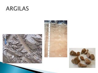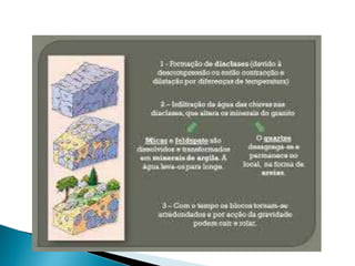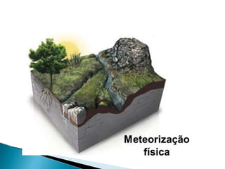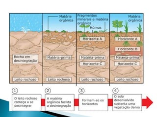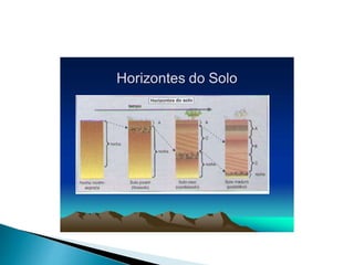 O documento descreve os processos de formação de solos através da degradação e fragmentação de rochas, incluindo a formação de areia, silte, argila e cascalho. Detalha os cinco horizontes que compõem o perfil do solo e os organismos e processos associados a cada um.