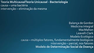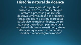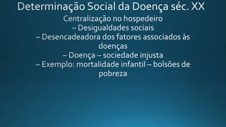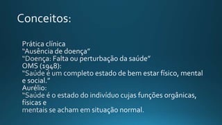 A saúde é determinada por fatores biológicos, sociais e psicológicos. Condições como alimentação, educação, renda e meio ambiente, resultantes da organização social e econômica, afetam profundamente os níveis de saúde entre grupos. Ao longo da história, diferentes culturas tiveram visões distintas sobre a causa e tratamento da doença.