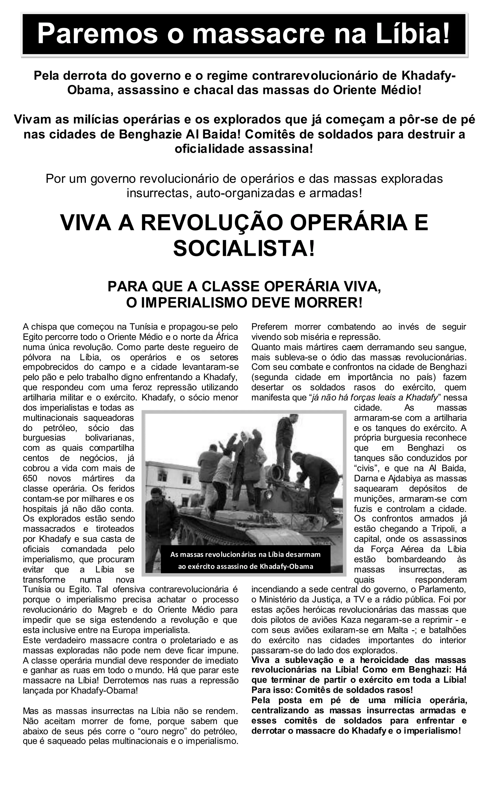 3) O documento defende a revolução operária e socialista na Líbia e no Oriente Médio e pede a derrubada dos governos imperialistas.