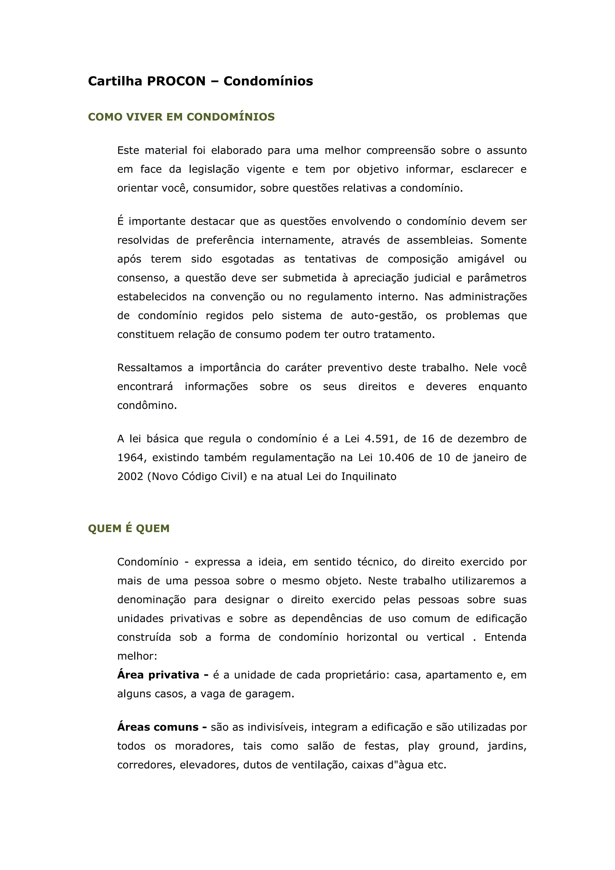 Este documento fornece informações sobre condomínios residenciais no Brasil. Explica quem são os condôminos e suas responsabilidades, como funciona a administração do condomínio, as normas estabelecidas na convenção e regimento interno, a realização de assembleias e quoruns necessários para votações, além de tratar das despesas ordinárias e pagamentos de condomínio.