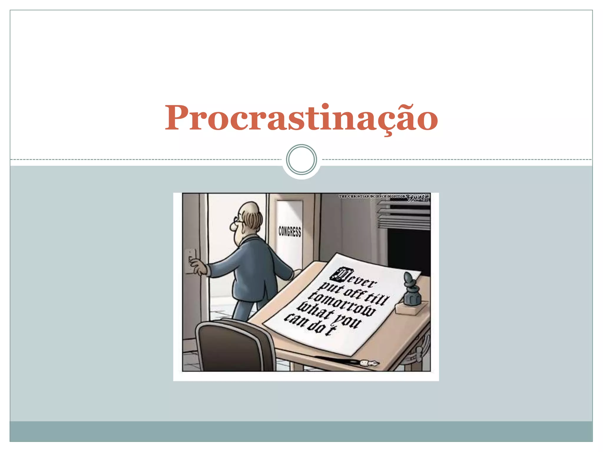 Procrastinação é adiar tarefas ou ações e pode ocorrer por diversas razões como evitar o medo de fracasso. Pessoas que procrastinam têm dificuldade em priorizar tarefas e iludem a si mesmas dizendo que farão melhor amanhã. Procrastinação pode causar problemas emocionais, físicos e sociais como estresse, ansiedade e prejuízos profissionais.