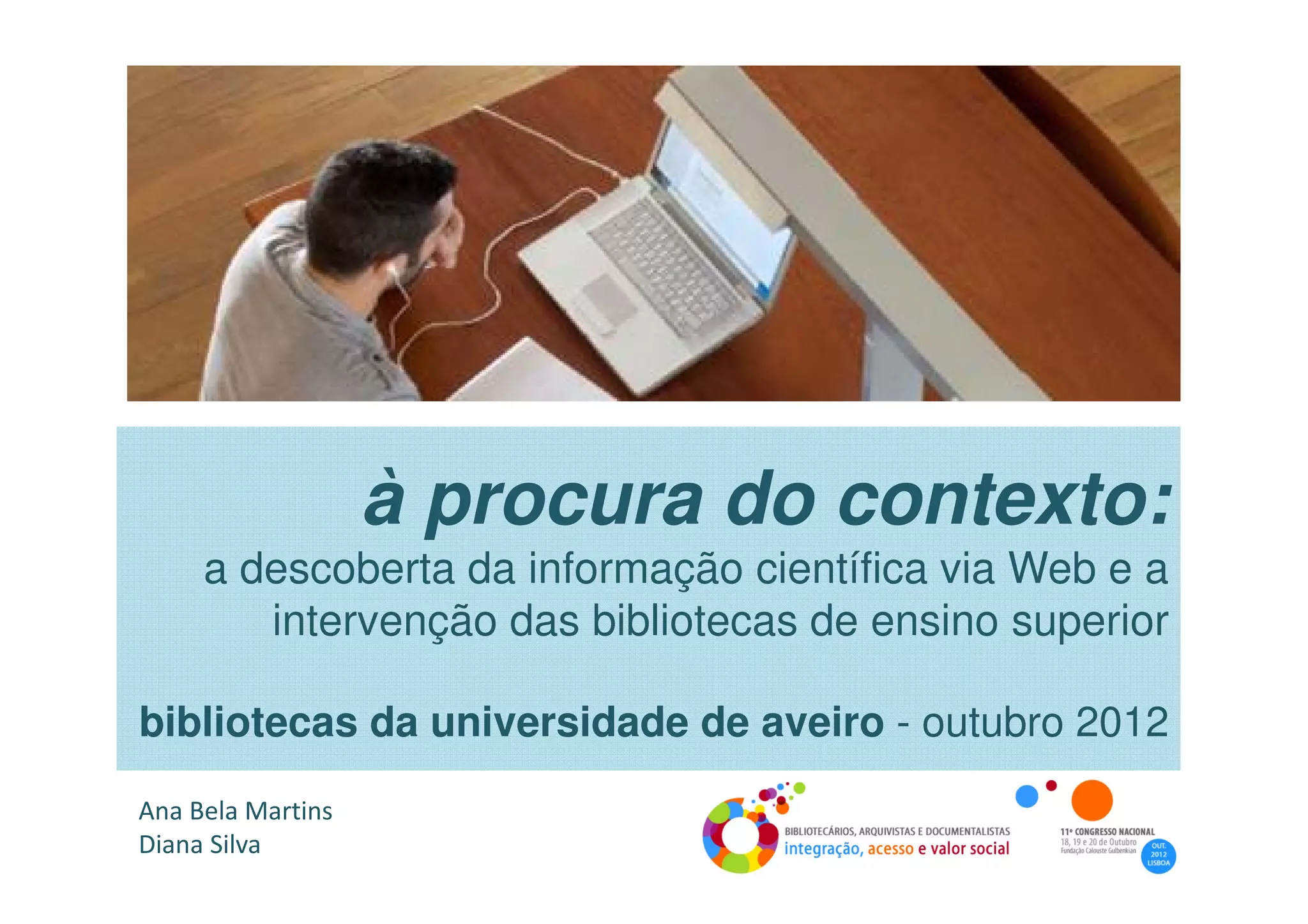 Este documento discute os desafios enfrentados pelos alunos e pesquisadores no ensino superior para descobrir e usar informação científica na era digital. Também descreve como as bibliotecas universitárias da Universidade de Aveiro, Portugal, estão abordando esses desafios através da oferta de conteúdo, formação contínua de funcionários e integração de serviços.