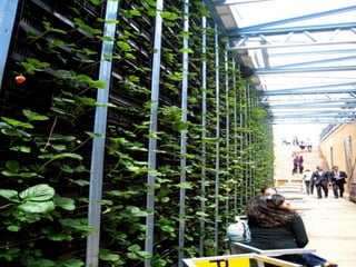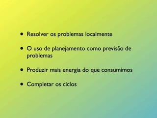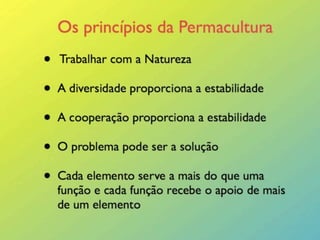 Este documento discute estratégias para produção de alimentos orgânicos de forma sustentável, incluindo usar a biodiversidade e sucessão ecológica, escolher o local correto, preparar o solo, adubar de forma natural, plantar companheiras e cultivar de forma holística.