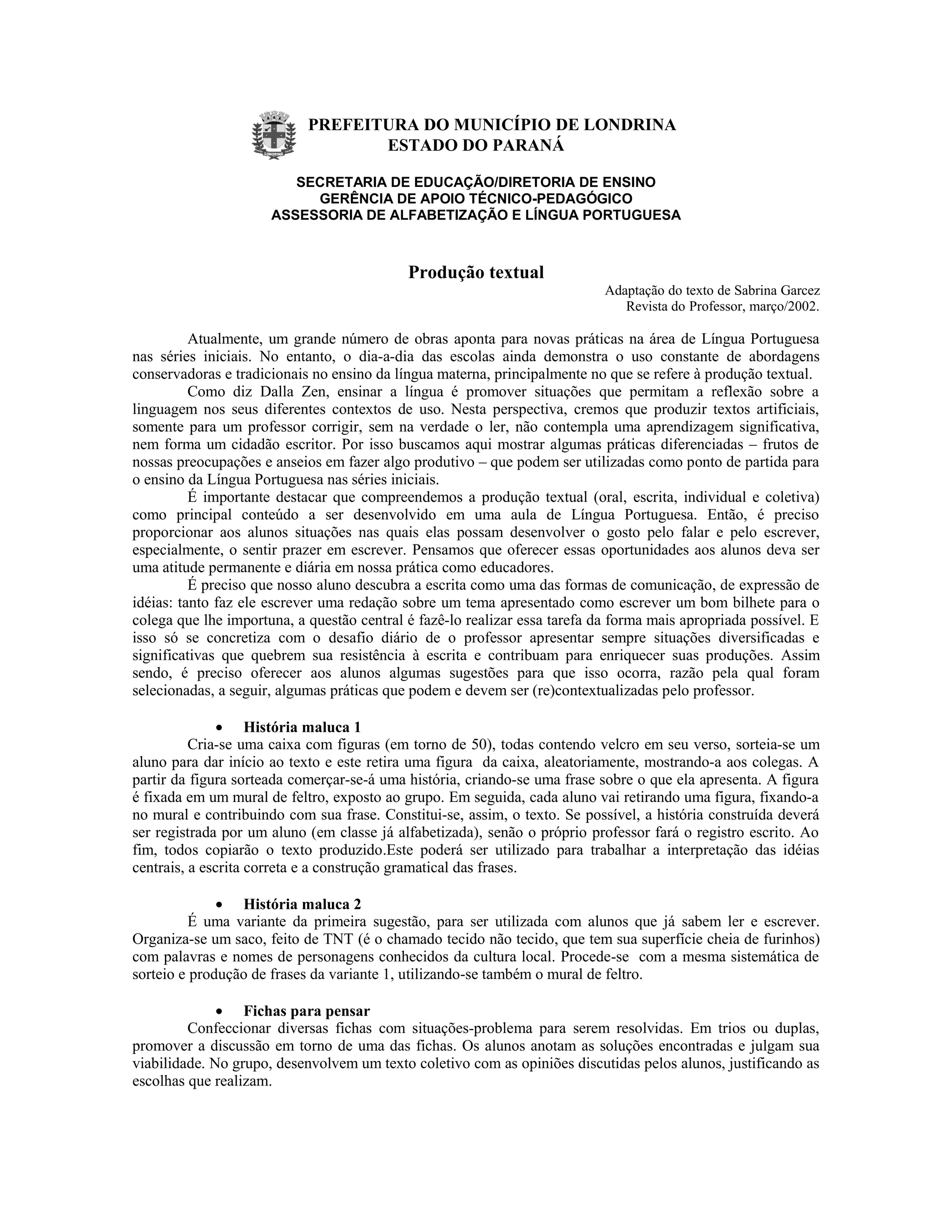 O documento discute práticas diferenciadas para o ensino da produção textual nas séries iniciais. Propõe atividades como a construção de histórias coletivas a partir de figuras sorteadas, jogos com palavras e situações-problema para estimular a escrita e o desenvolvimento do gosto pela linguagem. A produção textual deve ser compreendida como principal conteúdo da língua portuguesa e é importante oferecer diversas oportunidades significativas para quebrar a resistência dos alunos à escrita.