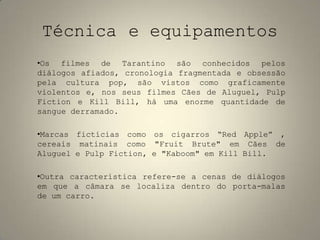 Quentin Tarantino é um diretor americano nascido em 1963 conhecido por seus diálogos afiados e violência gráfica. Seu filme de estreia Cães de Aluguel em 1992 foi um sucesso, assim como Pulp Fiction em 1994 que ganhou o Oscar de Melhor Roteiro Original. Ele continuou a dirigir filmes populares como Kill Bill e Bastardos Inglórios.