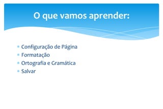 Este documento fornece instruções sobre como formatar e corrigir documentos. Ele explica como configurar páginas, formatação de fontes e parágrafos, e como usar ferramentas ortográficas e gramaticais para corrigir erros. O documento também lista atividades práticas para os alunos aplicarem o que aprenderam.