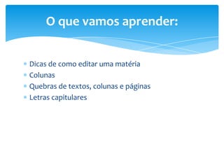 1) O documento fornece dicas sobre como editar matérias jornalísticas, incluindo o uso de colunas, quebras de texto, letras capitulares e fotos.
