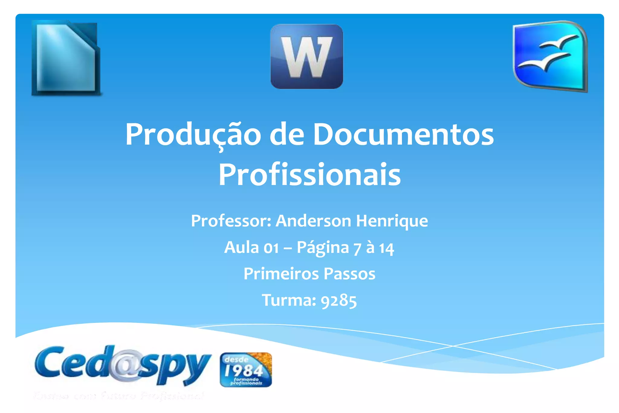 Este documento fornece instruções sobre a produção de documentos profissionais. Ele discute o que é um texto, aplicativos comuns para produção de texto e dicas de digitação. O objetivo do módulo é ensinar os estudantes a criar vários tipos de documentos profissionais com facilidade usando processadores de texto.
