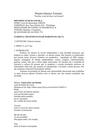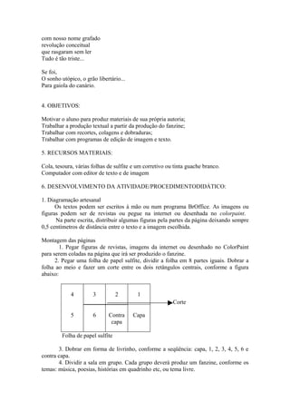 Este documento descreve um projeto para produção de fanzines com alunos de 6o a 9o ano. Os objetivos são motivar a produção textual dos alunos e trabalhar com gêneros literários e recursos gráficos como recortes e colagens. Os alunos serão divididos em grupos para produzir fanzines sobre temas como música, poesia e histórias em quadrinhos.