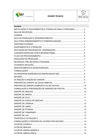 Instalações necessárias para a produção de licores, incluindo sala de recepção, cozinha, sala de produção e engarrafamento, sala de armazenamento e sanitário. Equipamentos e utensílios, como panelas, balanças e liquidificador. Processo de produção que inclui recepção da matéria-prima, seleção, lavagem, descasque, formulações, infusão, filtração, adição de xarope, engarrafamento e armazenamento. Cuidados com a higiene das instalações e matéria