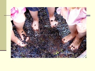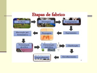 O documento descreve as diversas fases do processo de produção do vinho, incluindo a fase do fruto, transformação, maturação, guarda e consumo. Detalha etapas como poda, fermentação, clarificação e envelhecimento, necessárias para criar vinhos de diferentes tipos e qualidades.
