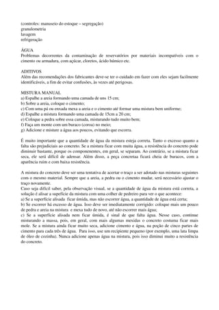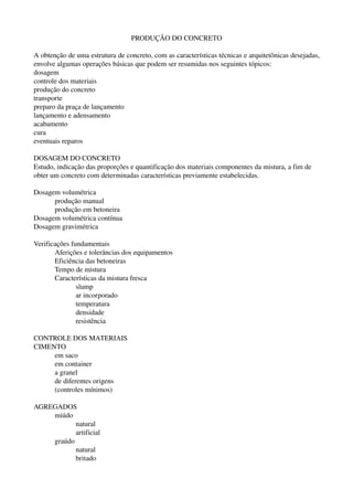 O documento descreve o processo de produção do concreto, incluindo dosagem dos materiais, controle de qualidade, mistura, transporte, lançamento e adensamento. As etapas principais são a dosagem dos agregados, cimento e água; a mistura mecânica ou manual; o transporte por caminhões betoneira ou bombas; a colocação no local de aplicação; e o adensamento para remover bolhas de ar.
