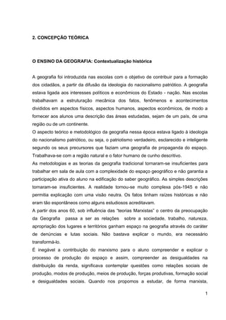Este documento discute a proposta curricular de geografia para a Educação de Jovens e Adultos no município de Açailândia, Maranhão. Ele descreve a evolução histórica do ensino de geografia, desde a ênfase inicial no nacionalismo patriótico até abordagens mais críticas influenciadas pelo marxismo, e destaca a importância de diferentes concepções teóricas e metodologias interdisciplinares. Também enfatiza o papel do professor como facilitador que usa práticas pedagógicas relevantes para