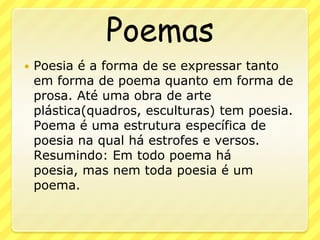 PoemasPoesia é aforma de se expressar tanto em forma de poema quanto em forma de prosa. Até uma obra de arte plástica(quadros, esculturas) tem poesia.Poema é uma estrutura específica de poesia na qual há estrofes e versos.Resumindo: Em todo poema há poesia, mas nem toda poesia é um poema.
